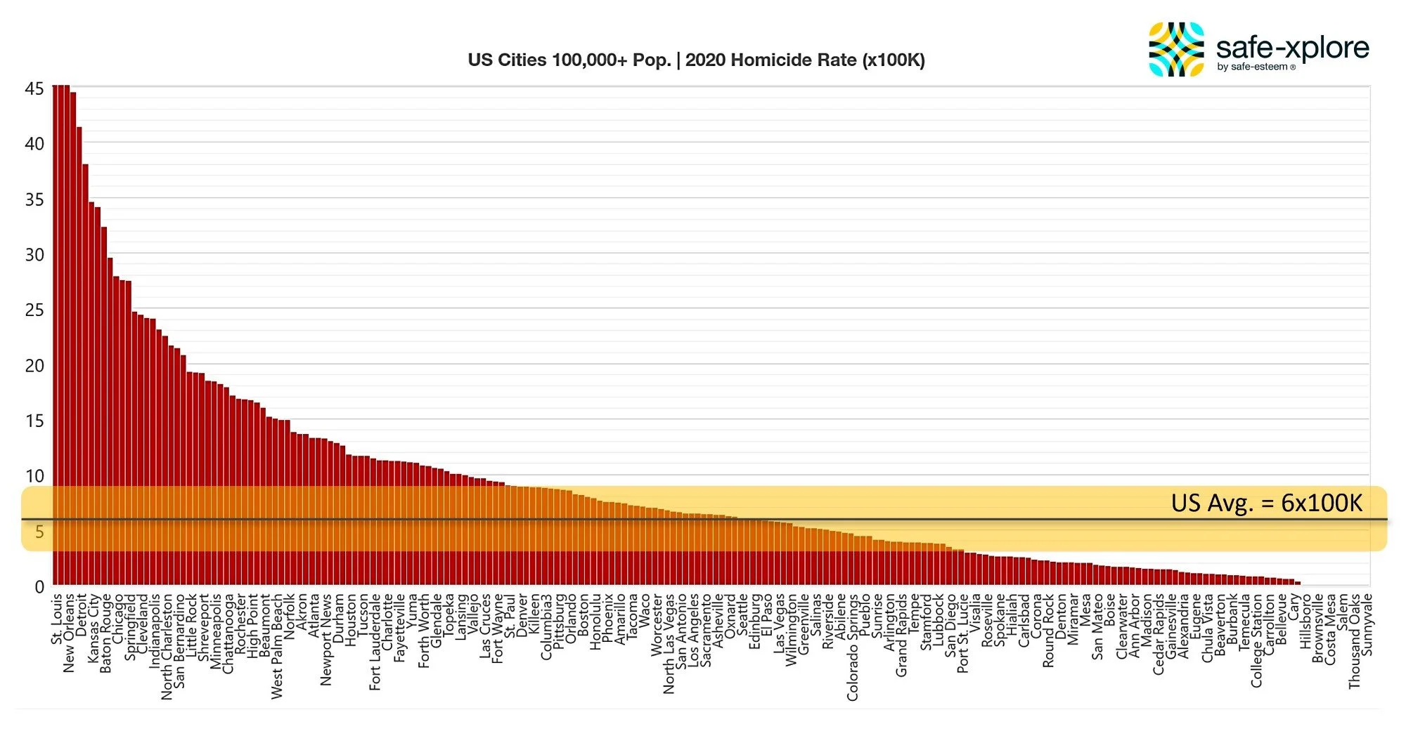The United States’ homicide rate currently hovers around six (6) per 100K. So let’s assume that any rate between three (3) and nine (9) per 100K would fall in the same rank or class — i.e., ‘Yellow’ or ‘Level 2’ — which is more or less how these nominal scales are built.